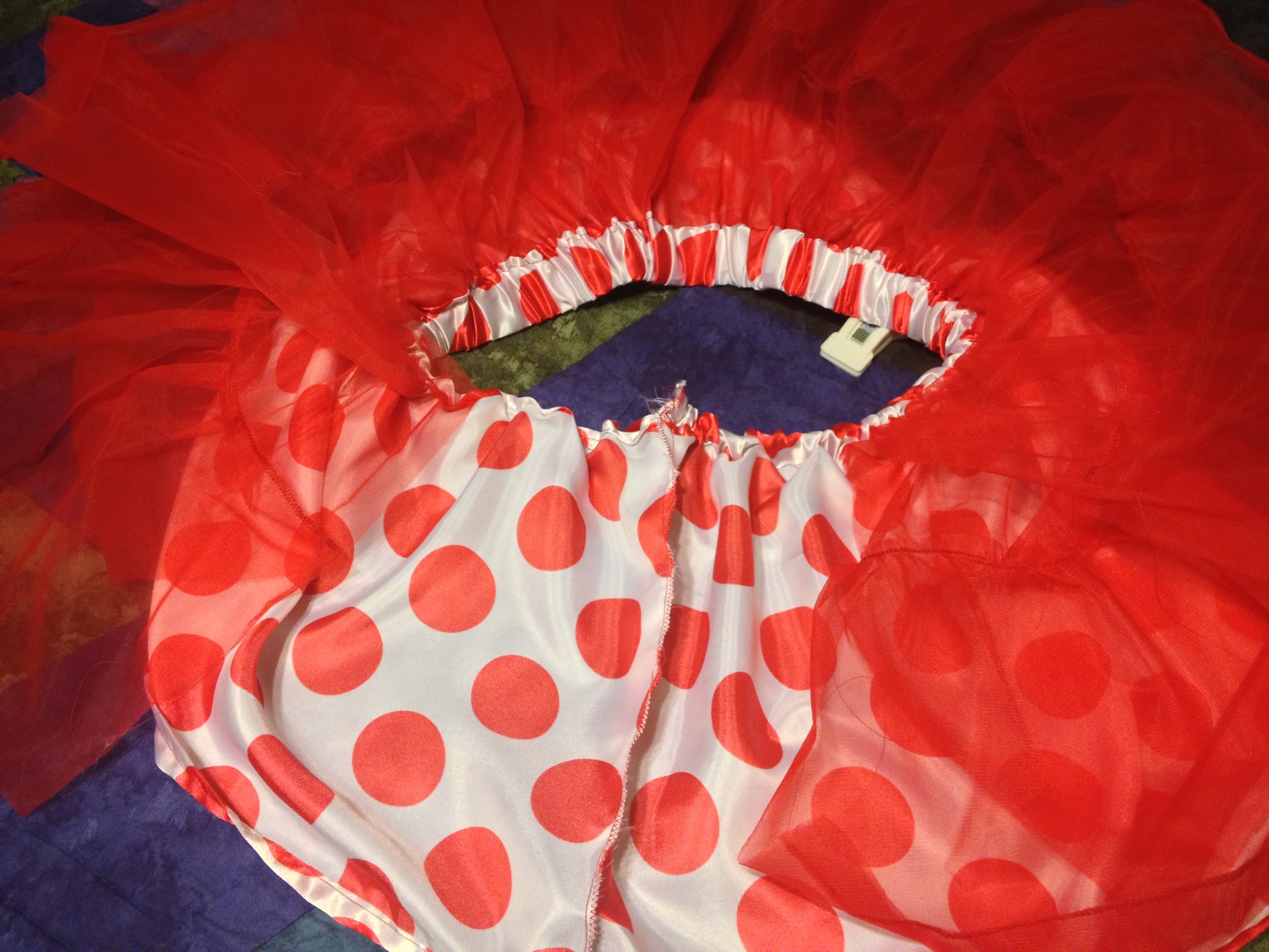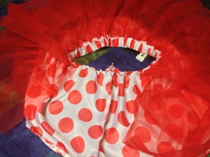 oh what a fail – I have to admit I was excited about doing this – creating a Minnie Mouse skirt for my daughter & I thought about it (how to put it all together) for a couple of days & now that’s it’s over – I feel like a loser … BIG L on my forehead!! argh! fail in so many ways …. wanted it to have a tutu underneath the skirt – looked at tutu’s … hey that looks easy!!! I can do that…. here are some pictures to show the fail …
